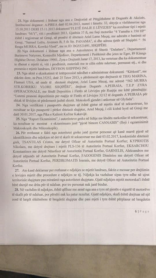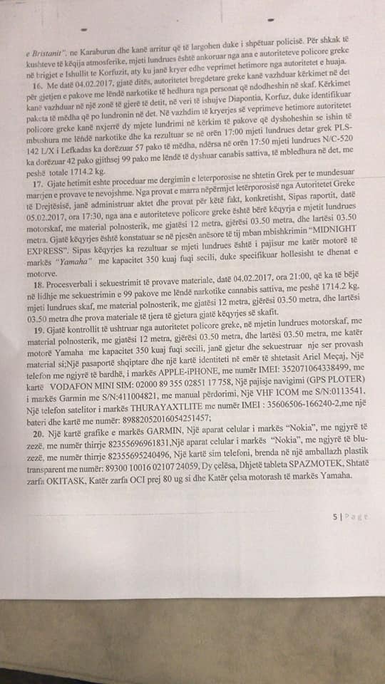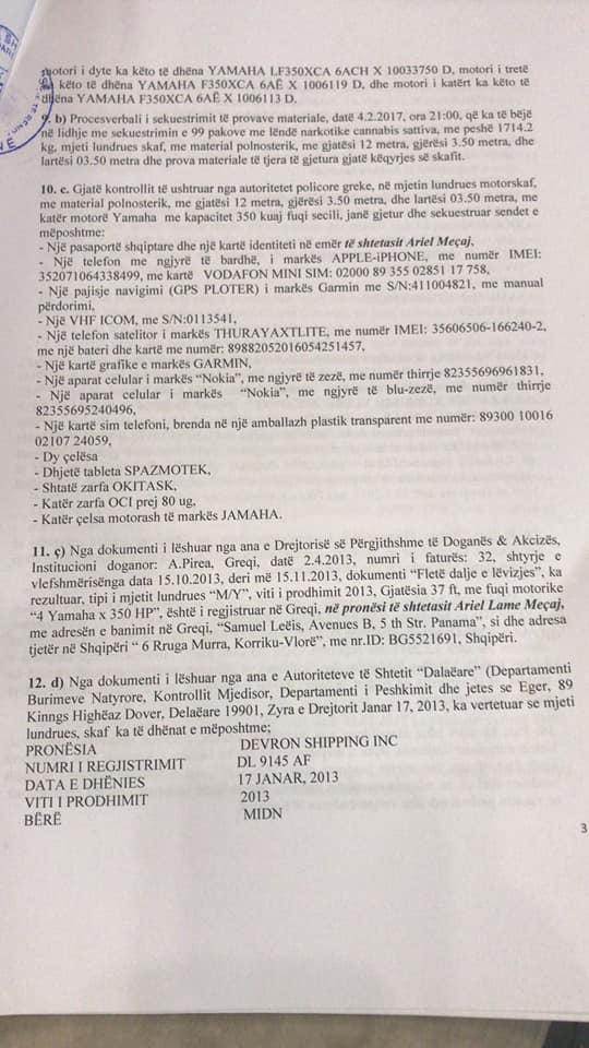 Me date 28.05. 2018 Prokroria per Krime te Renda ploteson hetimet per Ariel Mecaj dhe i kerkon Gjykates per Krime te Renda, nisjen e procesit gjyqsor. Policia greke doten e operacionit te kapjes se skafit me 3.2.2017, njekohesisht sekuestron 99 pako qe rezultojne canabis sattiva me nje peshe 1714 kilograme. Pra 1.7 ton.