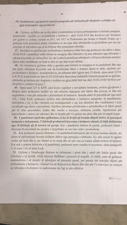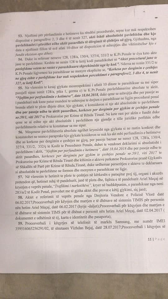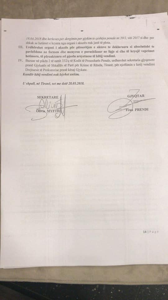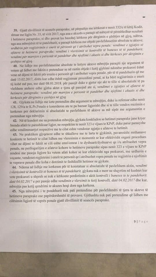 Dergimi ne Gjykate ka rezultuar pak pa fat me sa duket. Gjykata e kthrn pas kerkesen e prokurorise duke klasifikuar aktet abzolutosht te pavlefshne. Pavlefshmeria sipas Gjykates per Krime te Rend kishte te bente me afatin 10 ditor te njoftimit te mbylljes se hetimit, njoftim qe duhej te merrte i pandehuri dhe mbrojtesi i tij ligjor. Ne kete inventar ditor gjykates i mungojne gysma e diteve. Gjithashtu Gjykata, gjykatesi Fran Prendi, vlereson kryerjen e veprimeve hetimore te Prokurorise por vlereson se duhen edhe veprime te tjera si marrja e praktikes se berjes se pasaportes se dyte dhe bashkeshortja qe sipas avokatit ka te dhena te rendesishme. Nderkohe i pandehuri vijon te jete ne mungese dhe Gjykata kthen dhe nje here dosjen Prokurorise..