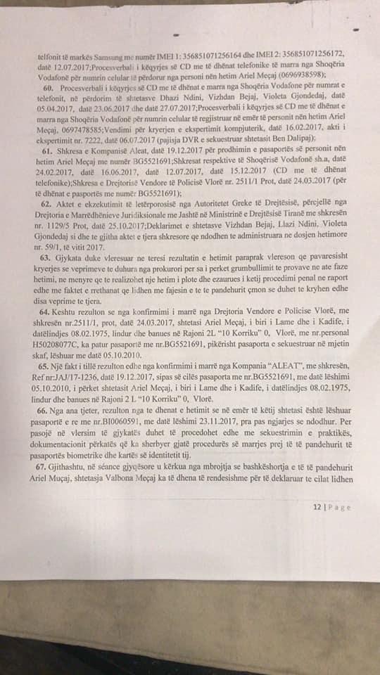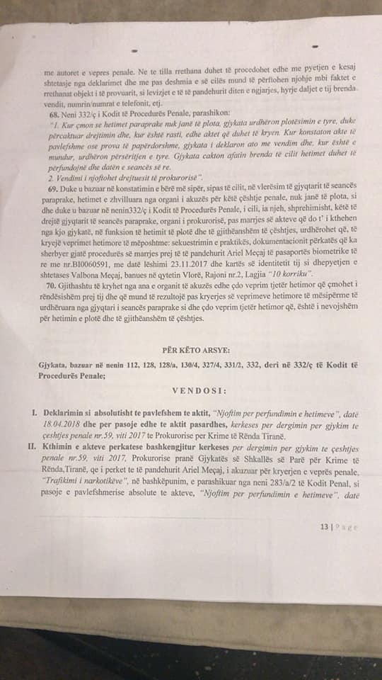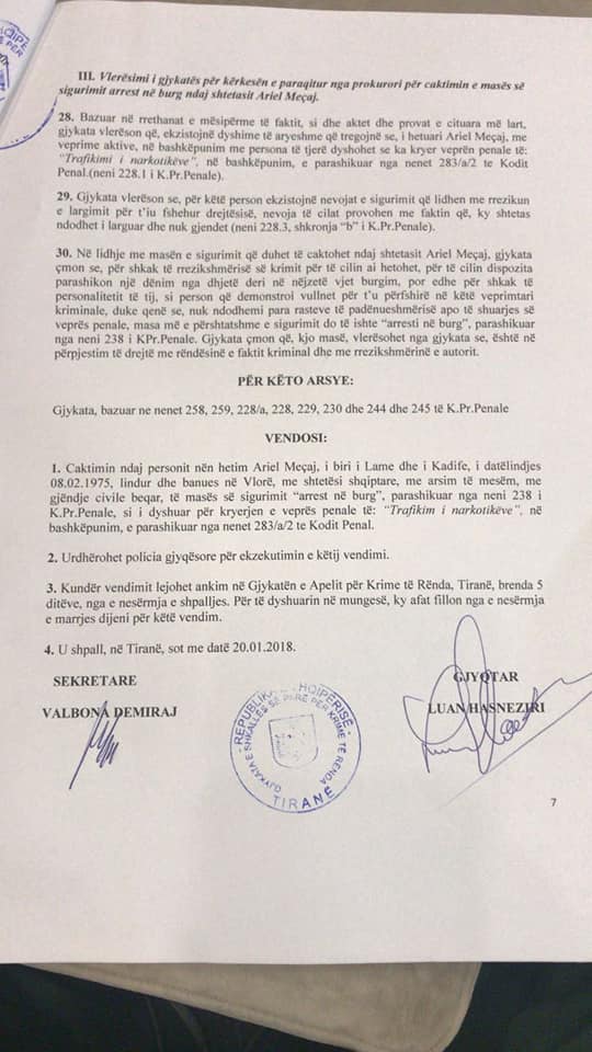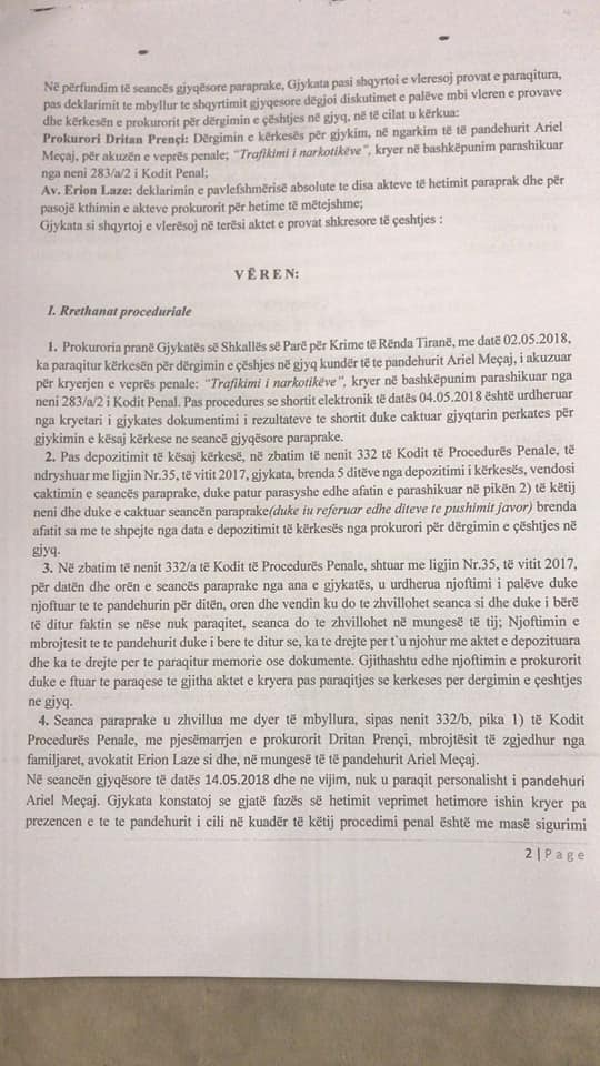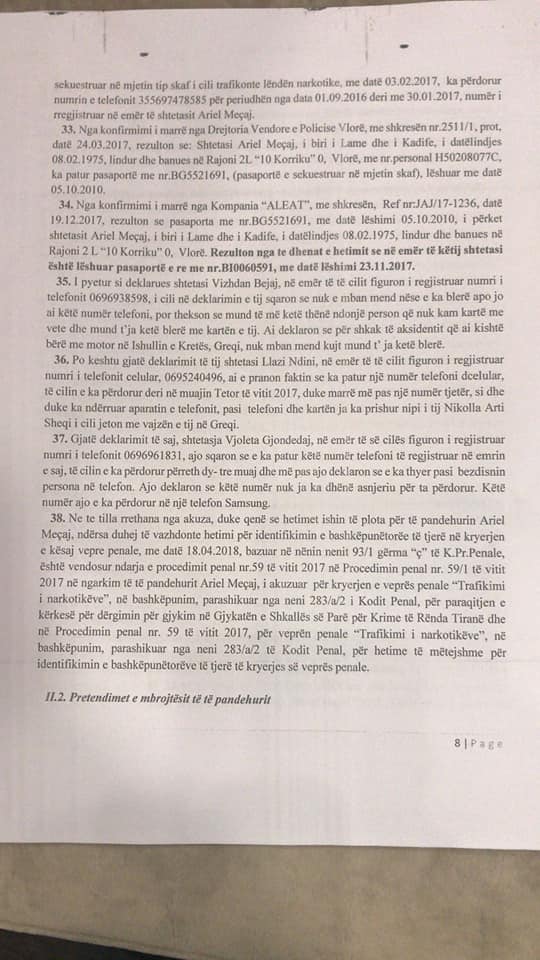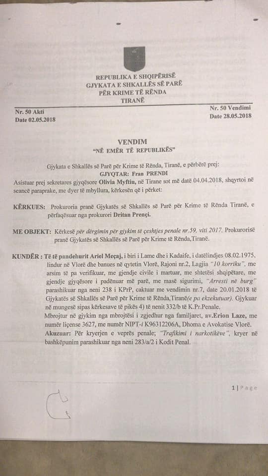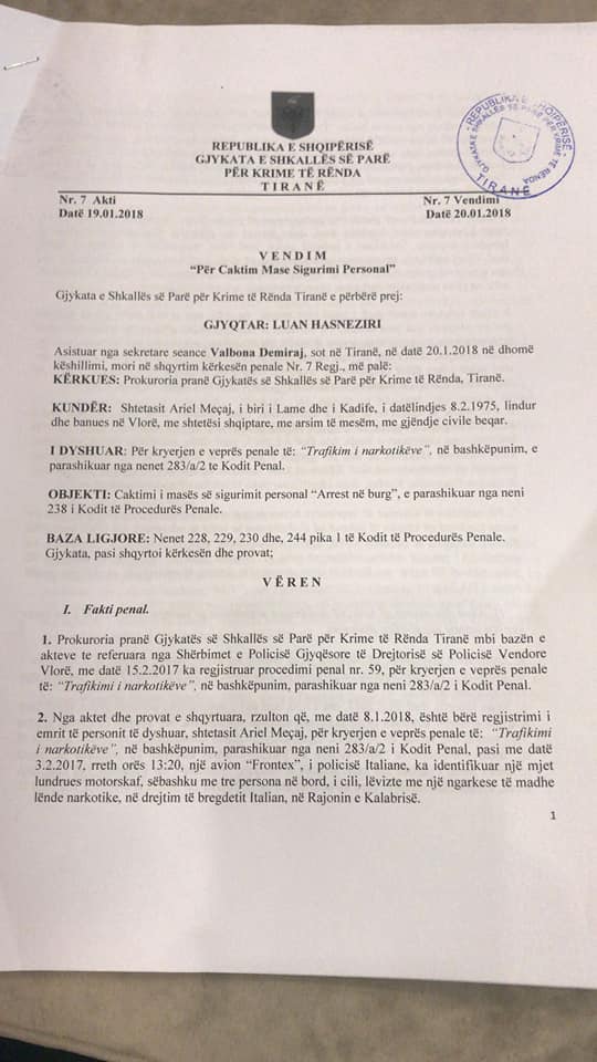 Hetimet bejne qe prokuroria per Krime te Renda sipas materialeve te referuara nga policia vendore Vlore me 8.1.2018 te regjistroje procedim penal ne ngarkim te Ariel Meçaj nen akuzen e trafikut te lendeve narkotike.