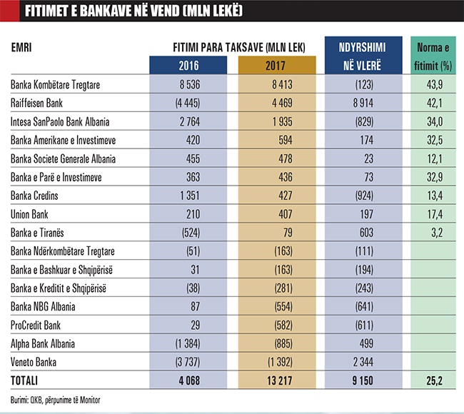 Ndikimin kryesor në përmirësimin e treguesve të sistemit e dha Banka Raiffeisen që kaloi nga humbje në fitime të larta, ulja e humbjeve të Alpha Bank dhe kalimi nga humbje në fitime minimale i Tirana Bank. Veneto Banka, që tashmë është përthithur nga Intesa Sanpaolo kishte humbjet më të mëdha në sistem, prej 1.4 miliardë lekësh, ndonëse me rënie në raport me 3.7 miliardë lekë që raportoi në 2016-n.
