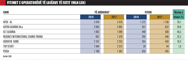 Në renditjen e 100 më të mëdhenjve ka 5 subjekte nga kategoria e kazinove dhe lojërave të fatit, nga 14 subjekte gjithsej të licencuara për këto aktivitete. Fitimet e këtyre 5 operatorëve në total ishin 3.7 miliardë lekë (27 milionë euro), apo sa një e treta e të ardhurave të raportuara. Normat e fitimit janë rritur dukshëm në 2017-n, në raport me një vit më parë.