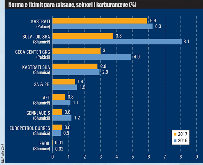Operatori më i madh i tregtimit të karburanteve me shumicë, Kastrati SHA (e teta në 2016-n) është një tjetër dalje, pas rënies me 8.3% të fitimeve, në 1.2 miliardë lekë.
