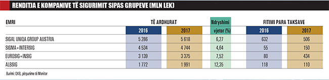 Sipas grupeve, kryeson Sigal Uniqa Group Austria, që është dhe operatori më i madh i tregut të sigurimeve, që së bashku me aktivitetin e jetës, jo jetës dhe pensioneve kishte gjithsej fitime prej 506 milionë lekësh.