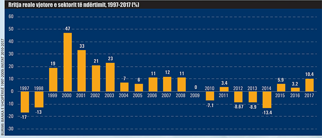 Ndërtimi është në ditët e tij më të mira, duke iu rikthyer rritjes, pas rënies ciklike të pas vitit 2008. Sipas shifrave të INSTAT, rritja vjetore e këtij sektori i kaloi 10% në 2017-n, niveli më i lartë në një dekadë, teksa vala e re e likuiditeteve në ekonomi po orientohet pikërisht në ndërtesa rezidenciale, kulla shumëkatëshe e resorte turistike. Këtyre u shtohen dhe projektet e pritshme të punëve publike, në kuadër të planit “One Billion”, ndërsa dhe punimet për ndërtimin e gazsjellësit TAP i kanë dhënë hov sektorit.