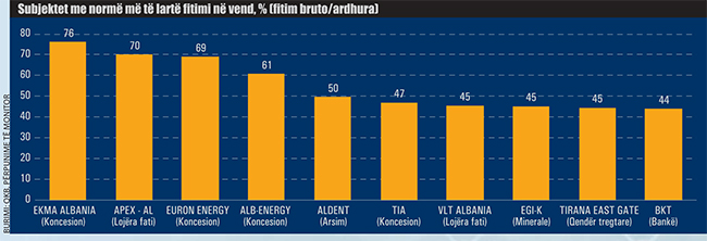 Europetrol Durrës Albania dhe Genklaudis, që renditen ndër 10 më të mëdhenjtë në vend për nga të ardhurat, nuk përfshihen në listën e fitimeve, teksa rezultati financiar para taksave ishte përkatësisht me 124 dhe 134 milionë lekë, me normë kthimi minimale prej 0.5-0.6%.