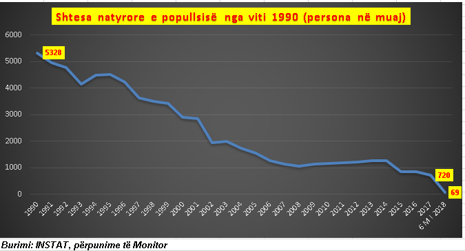 Në gjashtë muajt e parë të këtij viti, shtimi natyror i popullsisë (diferenca mes lindjeve dhe vdekjeve) ishte vetëm 484 persona, sipas të dhënave që janë publikuar nga INSTAT, ose vetëm 80 persona në muaj. Kjo shifër është shumë më e ulët në raport me shtimin natyror të vitit të plotë 2017, që ishte 8.637 persona (720 persona në muaj) dhe nëse vazhdihet me këto rime, viti 2018 pritet të mbyllet me ritmet më të ulëta historike të rritjes natyrale të popullsisë, të paktën që nga koha e Zogut.