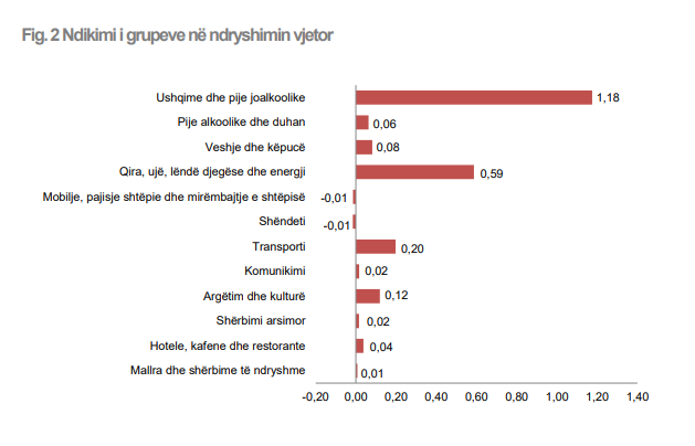 Çmimet e grupit “Argëtim dhe kulturë” kanë kontribuar me +0,12 pikë përqindje. Çmimet e grupit “Veshje dhe këpucë” kanë kontribuar me +0,08 pikë përqindje. Çmimet e grupit “Pije alkoolike dhe duhan” kanë kontribuar me +0,06 pikë përqindje.