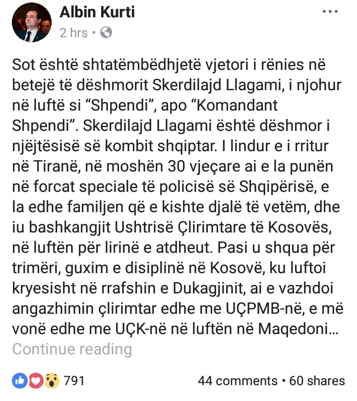 “Skerdilajd Llagami, dhe dëshmorët e luftëtarët e shumtë nga Shqipëria, trojet në Maqedoni, Mal të Zi, Luginë e nga mërgata, na kujtojnë se, edhe kur shtetet e kufijtë na kanë imponuar ndarjen, në historinë e kemi bërë së bashku,” tha lideri i Lëvizjes “Vetëvendosje duke përfunduar statusin e tj në rrjetin social Facebook :
