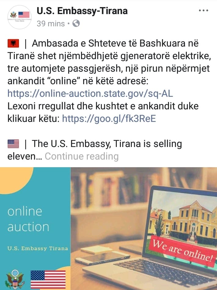 Ambasada e Shteteve të Bashkuara në Tiranë pë rmes një njoftimi në Facebook informon se shet njëmbëdhjetë gjeneratorë elektrike, tre automjete passgjerësh, një pirun nëpërmjet ankandit “online” në këtë adresë: https://online-auction.state.gov/sq-AL