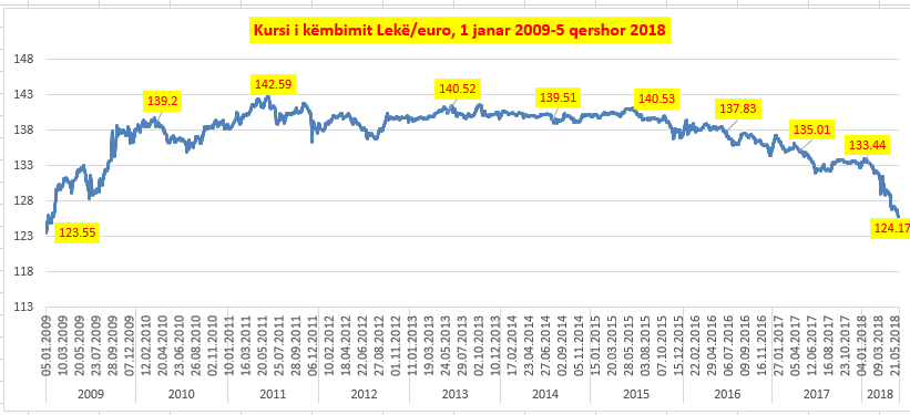 Në krahasim me fillim e këtij viti, euro ka rënë me 9.26 lekë, ose 7 për qind, duke shënuar rënien më të madhe të dekadës. Vetëm gjatë dy javëve të fundit, euro ka rënë me 3.14 lekë.