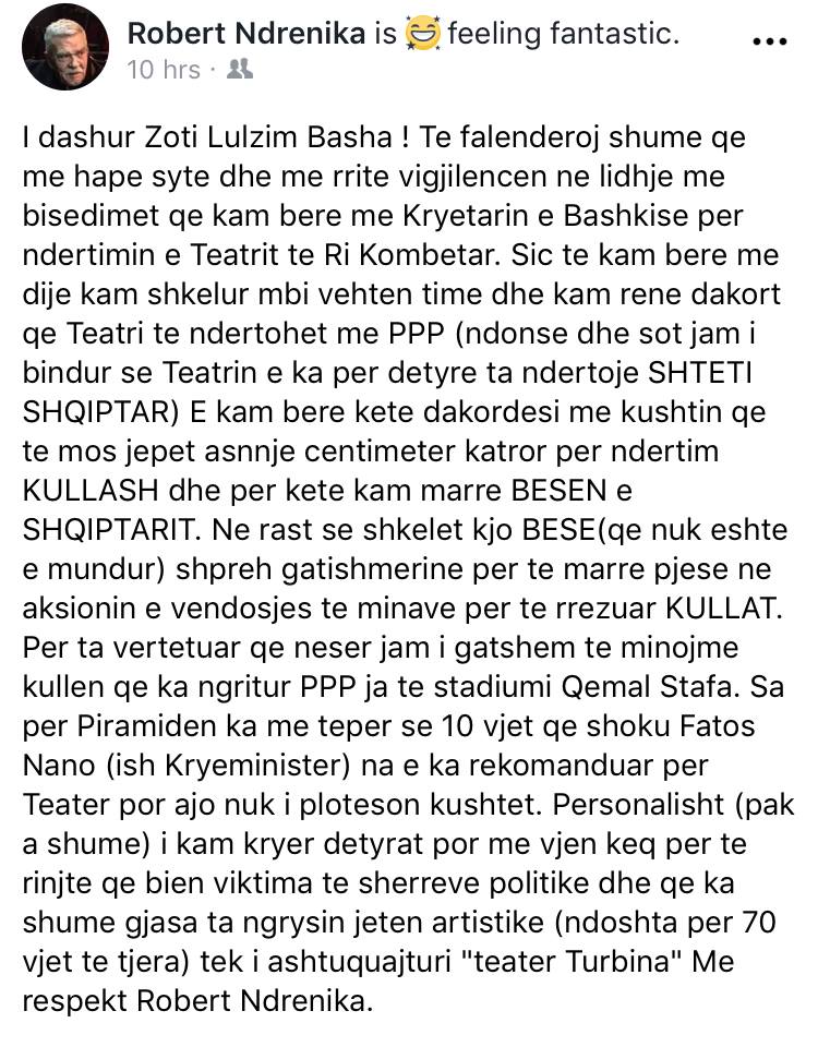 I dashur Zoti Lulzim Basha ! Te falenderoj shume qe me hape syte dhe me rrite vigjilencen ne lidhje me bisedimet qe kam bere me Kryetarin e Bashkise per ndertimin e Teatrit te Ri Kombetar. Sic te kam bere me dije kam shkelur mbi vehten time dhe kam rene dakord qe Teatri te ndertohet me PPP (ndonse dhe sot jam i bindur se Teatrin e ka per detyre ta ndertoje SHTETI SHQIPTAR) E kam bere kete dakordesi me kushtin qe te mos jepet asnnje centimeter katror per ndertim KULLASH dhe per kete kam marre BESEN e SHQIPTARIT. Ne rast se shkelet kjo BESE(qe nuk eshte e mundur) shpreh gatishmerine per te marre pjese ne aksionin e vendosjes te minave per te rrezuar KULLAT. Per ta vertetuar qe neser jam i gatshem te minojme kullen qe ka ngritur PPP ja te stadiumi Qemal Stafa. Sa per Piramiden ka me teper se 10 vjet qe shoku Fatos Nano (ish Kryeminister) na e ka rekomanduar per Teater por ajo nuk i ploteson kushtet. Personalisht (pak a shume) i kam kryer detyrat por me vjen keq per te rinjte qe bien viktima te sherreve politike dhe qe ka shume gjasa ta ngrysin jeten artistike (ndoshta per 70 vjet te tjera) tek i ashtuquajturi “teater Turbina.