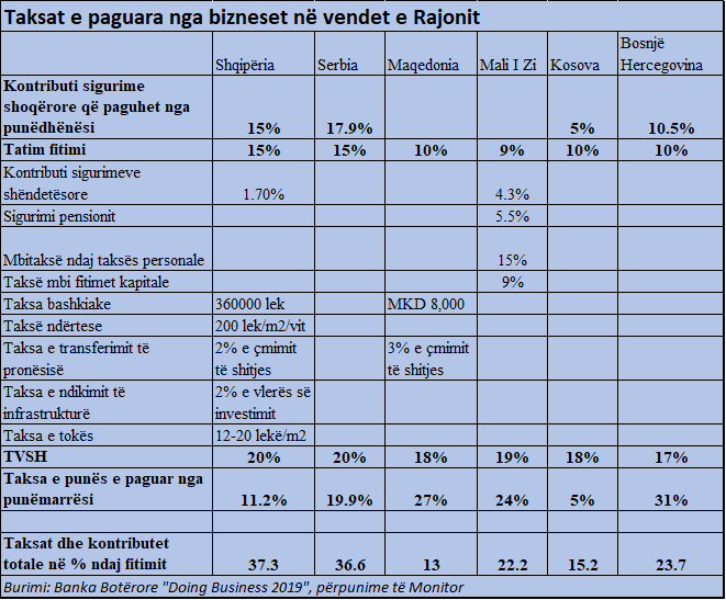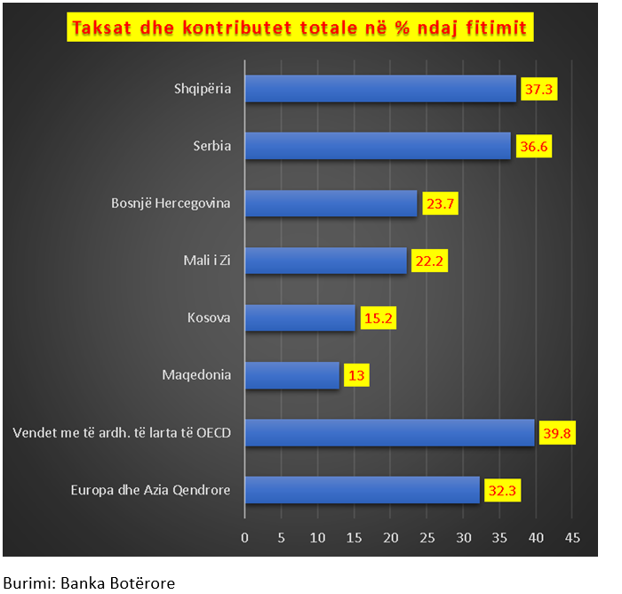 Ky nivel është më i larti në rajon edhe në krahasim me Serbinë, që ka nivele taksash të ngjashme me ne. Bizneset serbe paguajnë taksa e kontribute sa 36.6% të fitimeve.