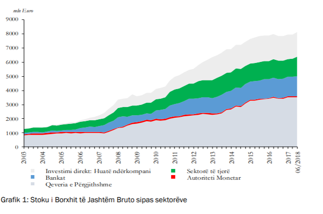 Ndërsa në fund të muajit qershor të vitit 2018, Borxhi i Jashtëm Bruto (BJB) i Shqipërisë shënoi rreth 8,111 milionë euro. Referuar nivelit në fund të vitit 2017, stoku i BJB u zgjerua me rreth 162 milionë euro, kryesisht në drejtim të borxhit afatgjatë të Sektorëve të tjerë (garantuar nga Qeveria e Përgjithshme).