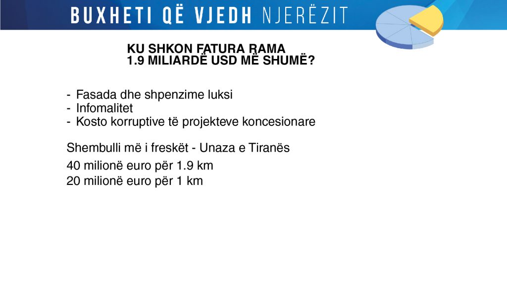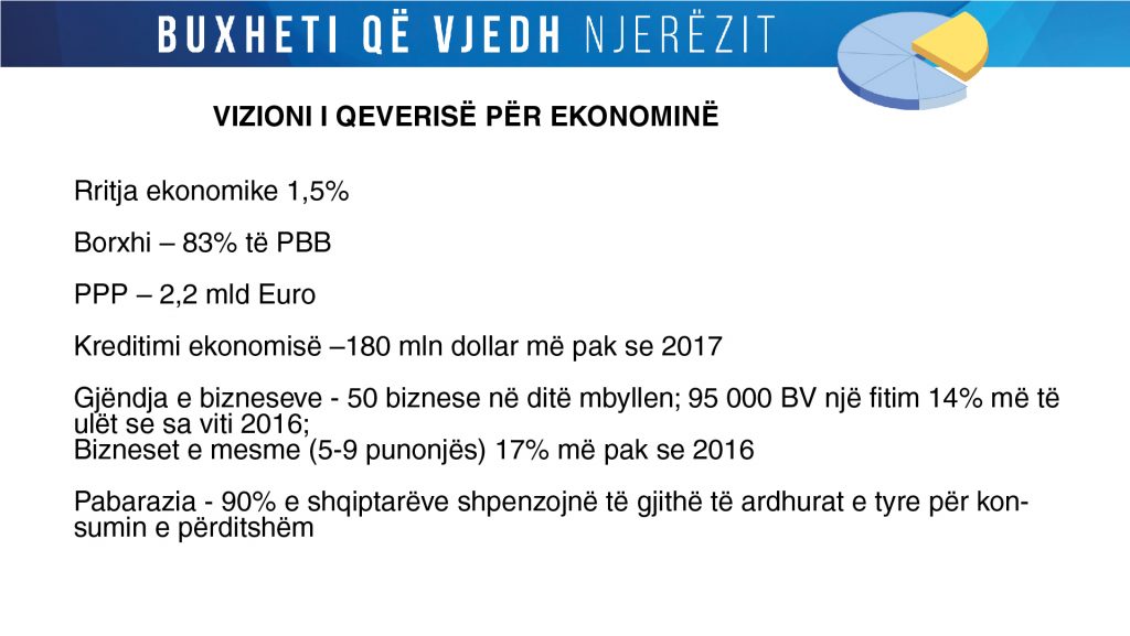 “Vetëm dy investimet më të mëdha, TAP dhe Kaskada e Devollit, sjellin 1 përqind rritje ekonomike. A ka menduar qeveria se si t’i zëvendësojë këto investime? Borxhi Publik ka mbërritur në 83 përqind, sepse kemi një buxhet jashtë buxhetit, për shkak të PPP-ve, që janë jashtë buxhetit dhe jashtë kontrollit. Sistemi bankar është pothuajse në kolaps”, tha Tabaku.
