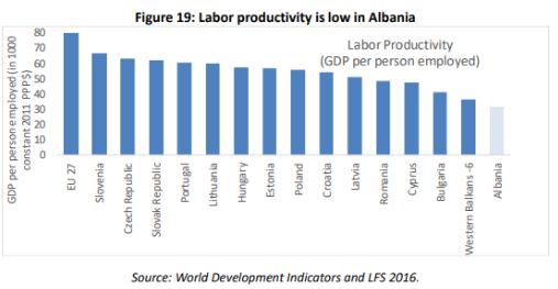 Niveli i produktivitetit të punës në Shqipëri është i ulët, në fakt më i ulët sesa në çdo vend tjetër të Europës Lindore, sipas Bankës Botërore.