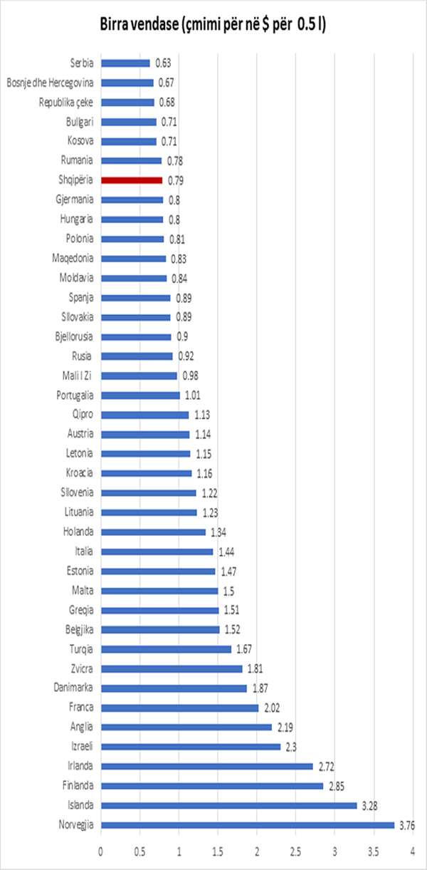 Më të shtrenjtat në rajon për sa i përket birrës vendase janë Maqedonia, ku 0.5 litër kushton 0.83 dollarë dhe Mali i Zi, ku 0.5l birrës vendase kushton 0.98 dollarë.