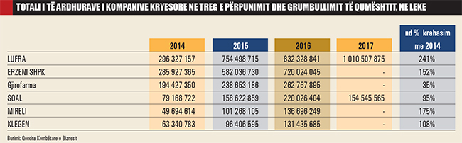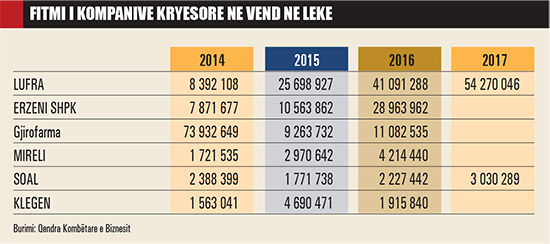 Në 2017-n, sipas pasqyrës së të ardhurave dhe shpenzimeve të kompanisë Lufra, fitimet ishin 54 milionë lekë, me një rritje prej 32% me bazë vjetore. Kompania Erzeni, gjatë 2016-s pati një fitim prej 28 milionë lekësh.
