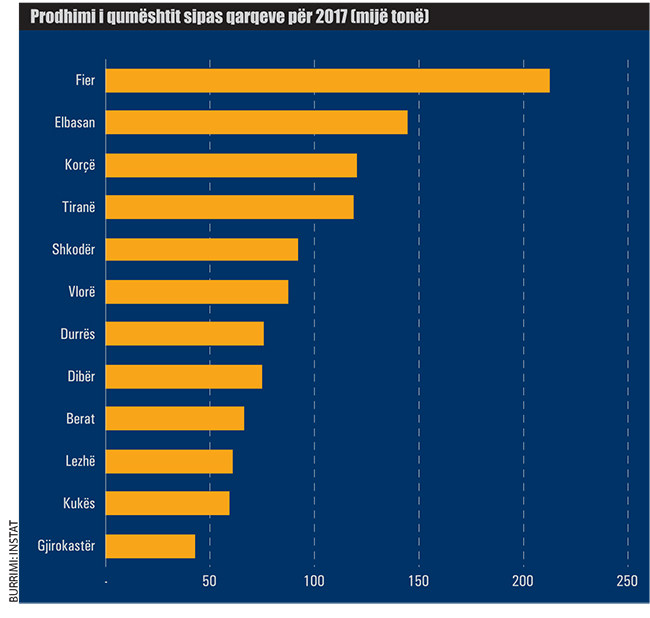Sipas të dhënave të INSTAT, qarku me prodhimin më të lartë të qumështit është Fieri, ku për 2017-n llogariten mbi 212 mijë tonë qumësht. Më pas renditen Qarku i Elbasanit me 144 mijë tonë, Korça me 120 mijë tonë, Tirana 118 mijë tonë qumësht. Ndërsa qarqet e tjera kanë një sasi nën 100 mijë tonë qumësht të prodhuar, më të ulëtën e ka Gjirokastra, me 42 mijë tonë qumësht.