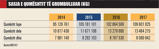 Sipas të dhënave të INSTAT, në vitin 2017 u vu re një rënie e numrit të krerëve të bagëtive, si në gjedhë dhe në të imta. Numri i gjedhëve në vitin 2017 është 475.215 krerë, duke shënuar rënie me 3,4%, në krahasim me vitin 2016. Në vitin 2007 u numëruan gjithsej 1.925.511 krerë, ose 2,3% më pak se në vitin 2016. Kategoria kryesore e të leshtave janë delet e qumështit me rreth 73% ndaj totalit të tufës.
