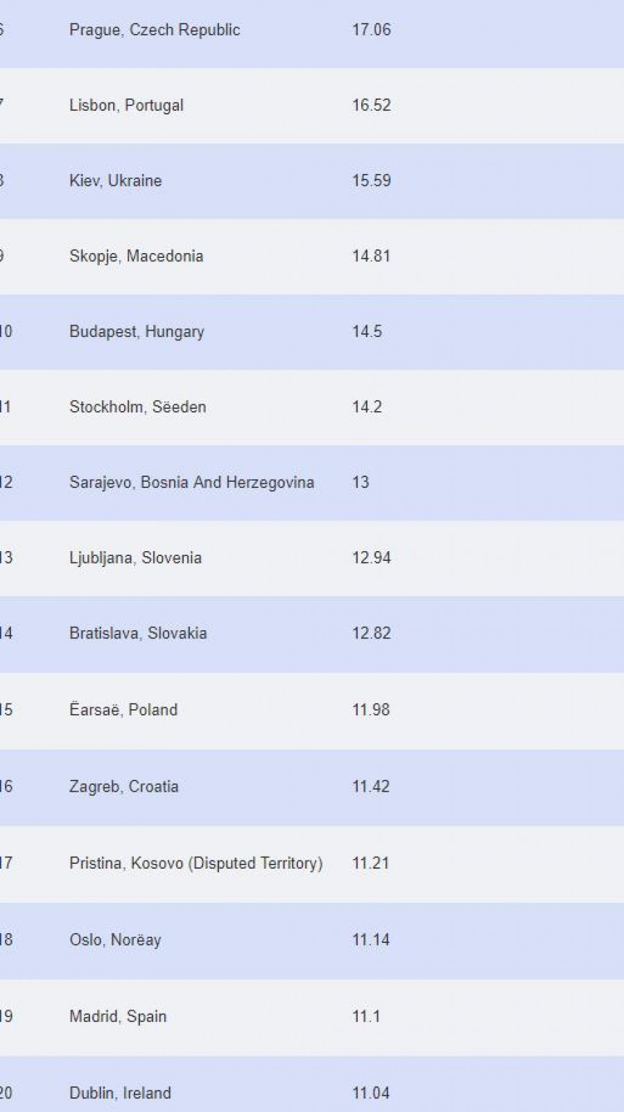 Në vend të parë, si më i shtrenjti, ndër kryeqytetet e Europës, për sa i përket përballimit është kryeqyteti i Serbisë, Beogradi, ku me të ardhurat e disponueshme duhen 21.2 vite për të blerë një apartament. Më pas renditen Roma, me 20.74, Moska me 19.85 vite dhe Parisi me 18.5 vite, të ndjekura nga Tirana.