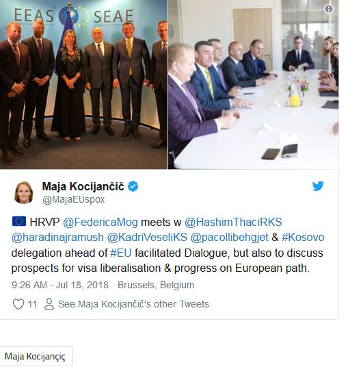 Në momentin kur kishte filluar takimi, Zëdhënësja e Komisionit Europian për Politika Fqinjësore dhe Negociata të Zgjerimit, Maja Kocijançiç, ka publikuar dy fotografi në llogarinë e saj në Tëitter, ku shihet delegacioni kosovar në takim me Përfaqësuesen e Lartë të BE-së, Federica Mogherini.