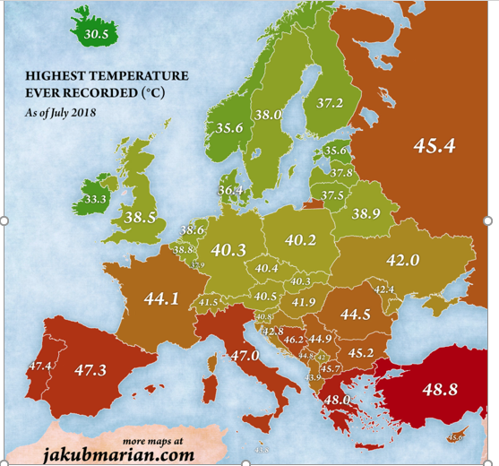 Në një hartë që ka publikuar portali  Jakub Marian Maps, temperatura më e lartë e regjistruar është 43.9 gradë Celsius. Krahasuar me rajonin, Shqipëria dhe Kosova kanë rekordin më të ulët. Temperatura më e lartë në Gadishullin Ballkanik është shënuar në Athinë, Greqi.