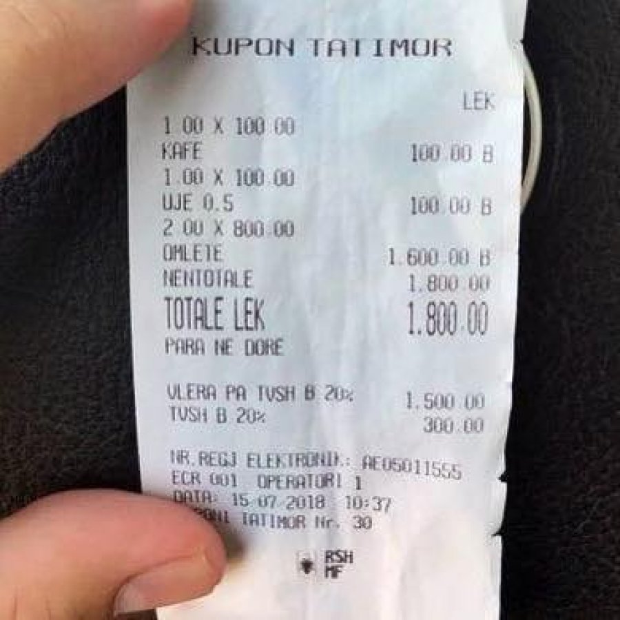 Gazetari Klodian Tomorri ka publikuar në Facebook një faturë restoranti ku një omlet me 2 vezë është faturuar 16 mijë lekë (të vjetra).