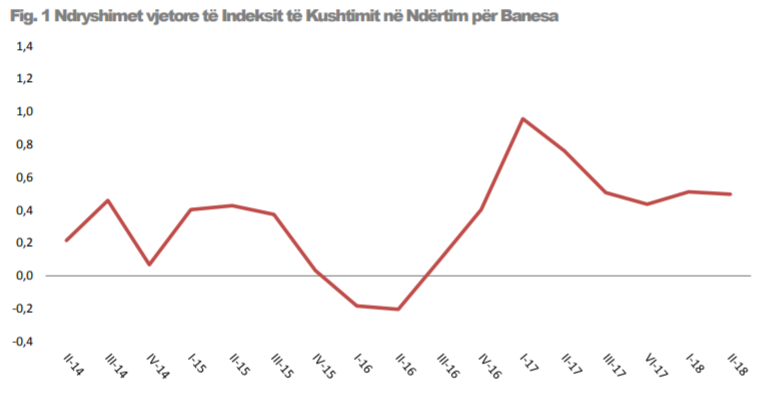 Në tremujorin e dytë 2018 ndryshimi tremujor i indeksit të kushtimit në ndërtim është 0,1 %.