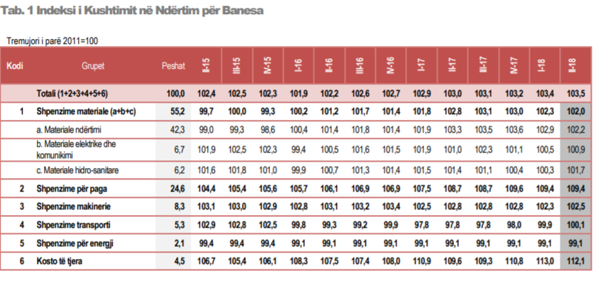Tremujori i parë i vitit 2011 shërben si periudhë bazë për llogaritjen e indeksit (tremujori i parë 2011=100). Shporta e re përbëhët nga 71 zëra nga të cilat 66 janë materiale ndërtimi.