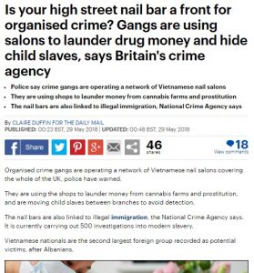 Në artikull thuhet se bandat e krimit të organizuar po veprojnë përmes salloneve vietnameze të rregullimit të thonjve, të shpërndara në të gjithë Mbretërinë e Bashkuar. Këto organizata kriminale mendohet se po përdorin sallonet për të pastruar paratë e fituara nga marijuana dhe prostitucioni, ndërsa aty bandat fshehin ‘viktimat’.
