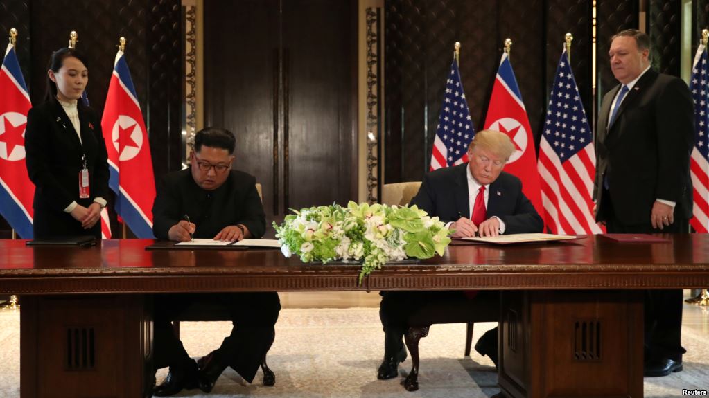 Presidenti i Shteteve të Bashkuara, Donald J Trump dhe kryetari i Komisionit të Çështjeve të Shtetit të Republikës Popullore Demokratike të Koresë, DPRK, Kim Jong Un zhvilluan samitin e parë historik në Singapor më 12 qershor 2018.