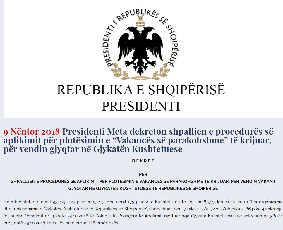 Presidenti i Republikës, në mbështetje të nenit 93, 125, 127 pikat 1/ç, 2, 3, dhe nenit 179 pika 2 të Kushtetutës, neneve 7 pika 2, 7/a, 7/b, 7/dh pika 2, 86 pika 4 shkronja ‘c’, të ligjit nr. 8577, datë 10.02.2000 ‘Për organizimin dhe funksionimin e Gjykatës Kushtetuese të Republikës së Shqipërisë’, i ndryshuar, si dhe Vendimit nr. 9, datë 24.10.2018 të Kolegjit të Posaçëm të Apelimit, njoftuar nga Gjykata Kushtetuese me shkresën nr. 380/4 prot, datë 29.10.2018, me cilësinë e organit të emërtesës, me qëllim plotësimin e ‘Vakancës së pararakoshme’, të krijuar në Gjykatën Kushtetuese, dhe me cilësinë e organit të emërtesës me Dekretin nr. 10946, datë 09.11.2018, ka miratuar;