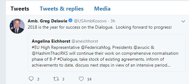 “Viti 2018 do të jetë vit i suksesit në dialog!” Kështu shprehet Ambasadori i Shteteve të Bashkuara në Kosovë, Greg Delawie përmes rrjetit social Twitter duke shfaqur një optimizëm për rezultatet konkrete nga dialogu përfundimtar Kosovë-Serbi, me ndërmjetësim të Bashkimit Evropian.