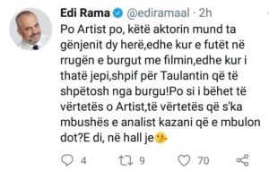 “Po Artist po, këtë aktorin mund ta gënjenit dy herë, edhe kur e futët në rrugën e burgut me filmin, edhe kur i thatë jepi, shpif për Taulantin që të shpëtosh nga burgu! Po si i bëhet të vërtetës o Artist, të vërtetës që s’ka mbushës e analist kazani që e mbulon dot? E di, në hall je.”