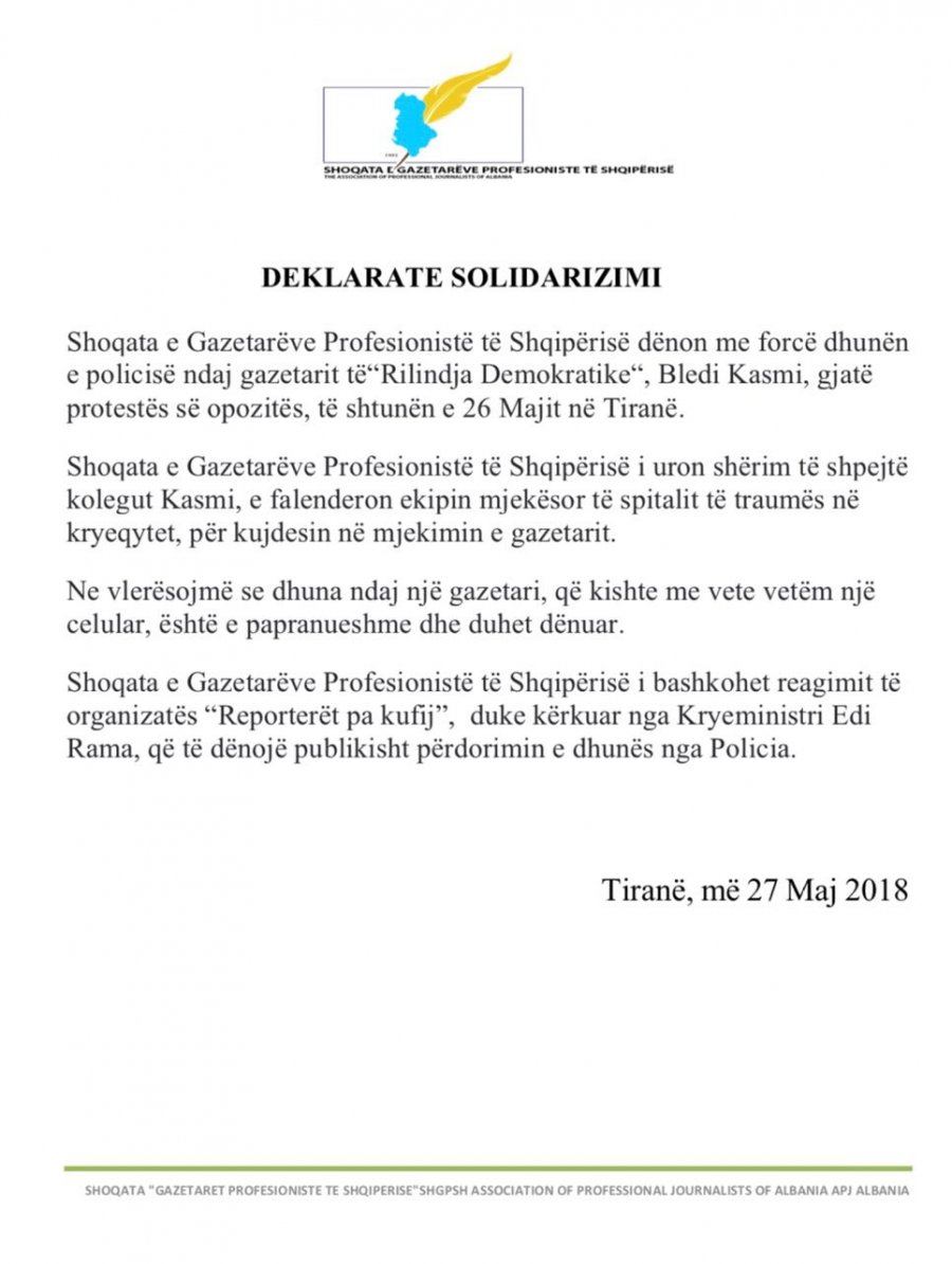 Përmes një deklarate për mediat, Shoqata e gazetarëve thekson se dhuna ndaj Kasmit është e papranueshme dhe duhet dënuar.