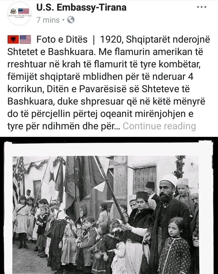 Shqiptarët kanë nderuar dhe nderojnë Shtetet e Bashkuara së cilës i janë mirënjohëse për ndihmën dhe përkrahjen në kohë të vështira, dhe kjo foto e vitit 1920, që risjellë Ambasada amerikane në Tiranë, ku shihen fëmijë shqiptarë, me flamurin amerikan të rreshtuar në krah të flamurit të tyre kombëtar, mblidhen për të nderuar 4 korrikun, Ditën e Pavarësisë së Shteteve të Bashkuara, vlen më shumë se 1.000.000 fjalë.