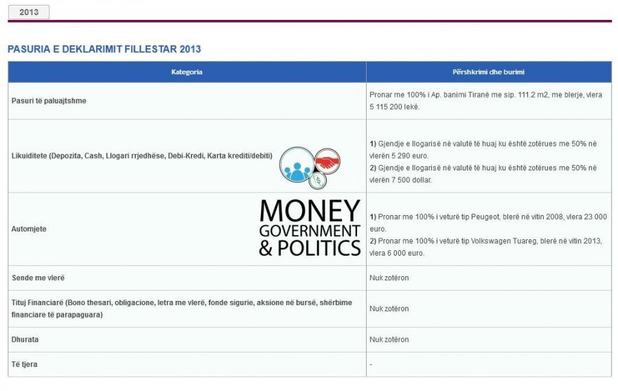 Në deklarimin e tij të parë, Veliaj ka treguar se zotëronte një apartament dhe dy makina. Njëra prej tyre është shitur në dhjetor të vitit 2017.