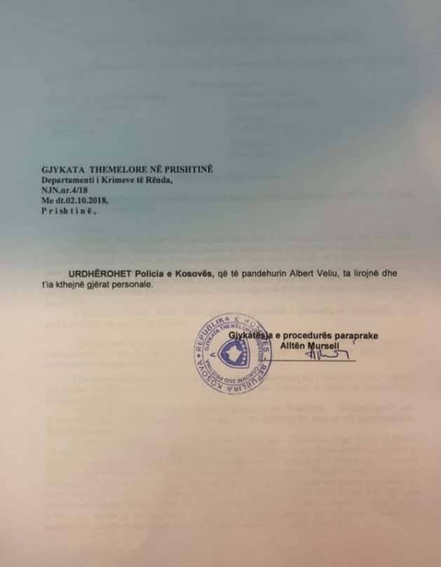 Me vendin të Gjykatës Themelore në Prishtinë, shtetasi nga Shqipëria, Albert Veliu i njohur si Babalja është liruar nga paraburgimi. Ai ishte arrestuar dje nga Policia e Kosovës në qendrën e Azilit në Magure të Lipjanit.
