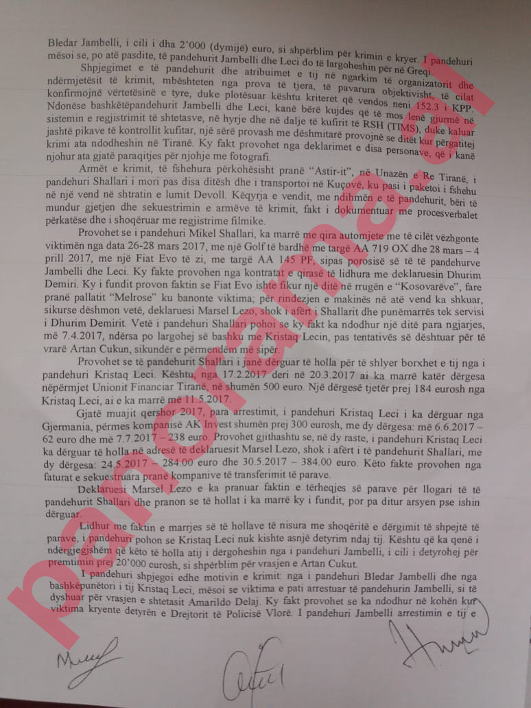 I pandehuri Shallari shpjegoi si ata vëzhgoheshin nga organizatori Jambelli i cili i nxiti të qëllonin. Në mbrëmje vonë të tre të pandehurit u takuan tek një lokal kur organizatori me tone fyese shprehu pakënaqësi ndaj tyre dhe i nxiti që krimin ta kryenin të nesërmen. I vënë përballë presionit, dhe i detyruar për shkak të faktit se kishte pranuar para nga Jambelli, i pandehuri mori përsipër ta kryente vetë ekzekutimin. I pandehuri ishte orientuar, ndërkohë, që të ndërronte numrat e telefonit një herë në dy ditë. Ai komunikonte vetëm me të pandehurin Leci, ndërsa me Jambellin nuk ka komunikuar asnjëherë. Nuk i dinte as numrat telefonikë që Jambelli përdorte.