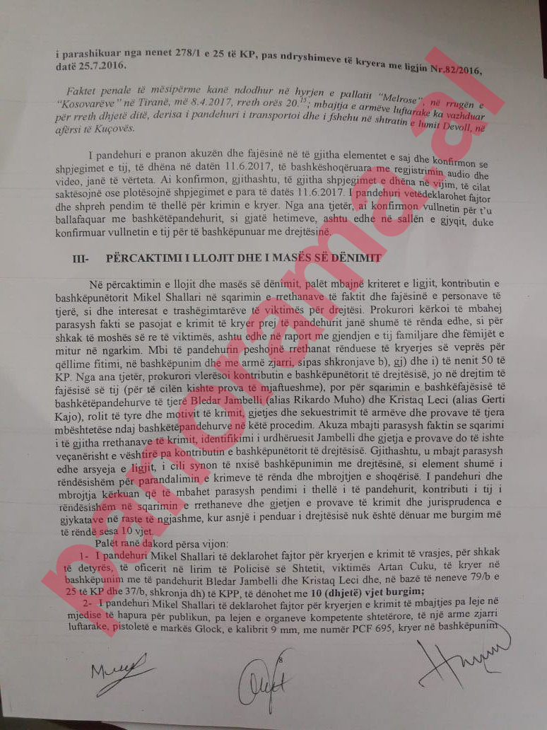 Sot është bërë dhe aktmarrëveshja mes Mikel Shallarit dhe Prokurorisë, me të cilën i ekzekutori i krimit dënohet vetëm me 10 vite burg, pasi ka bashkëpunuar me drejtësinë dhe ka treguar porositësit e kësaj ngjarje të rëndë.