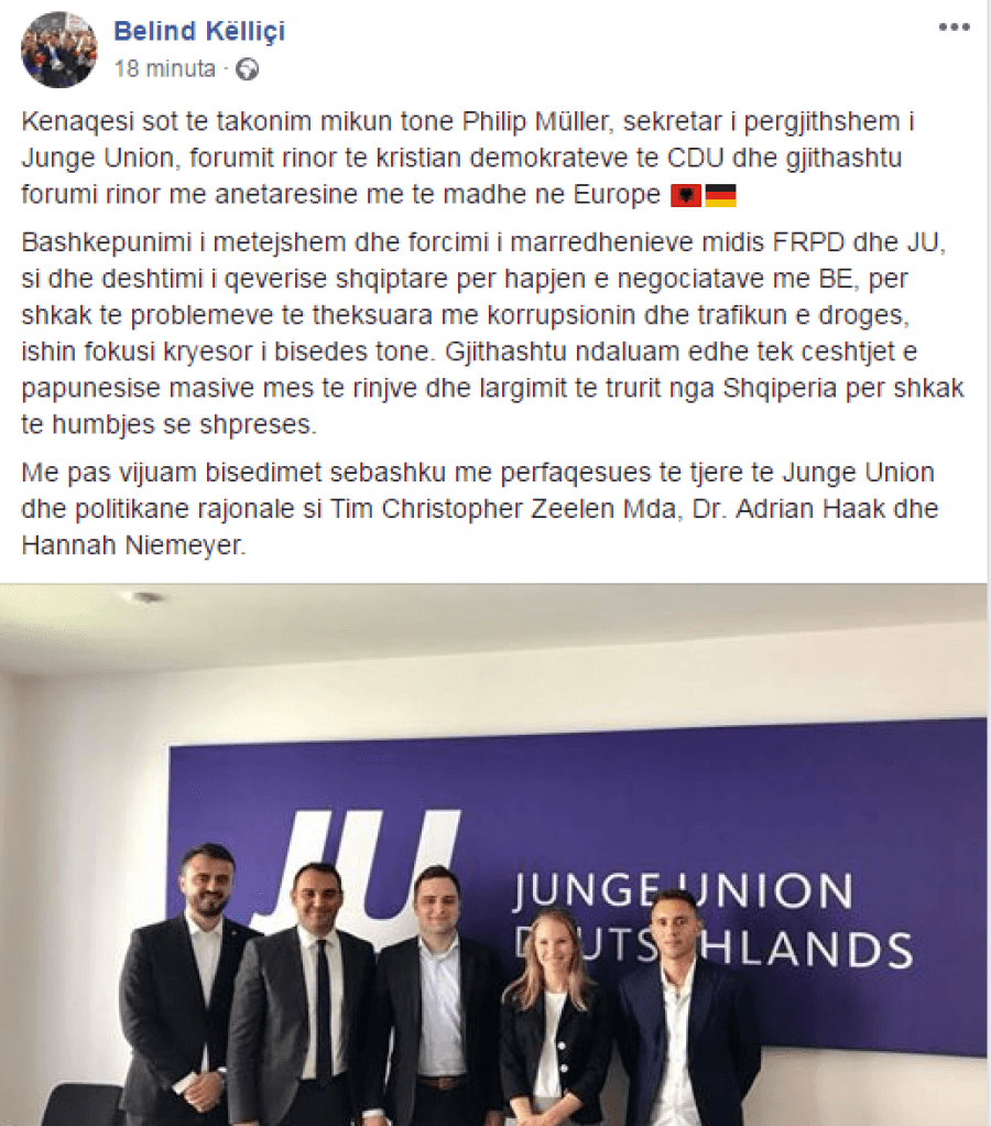 Ndërkohë sot delegecioni i të rinjëve të PD është takuar me Philip Müller, sekretar i pergjithshem i Junge Union, forumit rinor te kristian demokrateve të CDU dhe gjithashtu forumi rinor me anëtarësinë me të madhe në Europë.