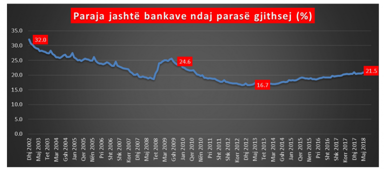 Kjo shumë është sa 21.5% e totalit të parasë që qarkullon gjithsej në vend, duke arritur në nivelin më të lartë që nga viti 2009, pra në nëntë vjet. Në periudhën 2008-2009 u konstatua një rrjedhje e depozitave nga sistemi bankar për shkak të frikës që u shkaktua në atë kohë nga efektet e krizës ekonomike globale.