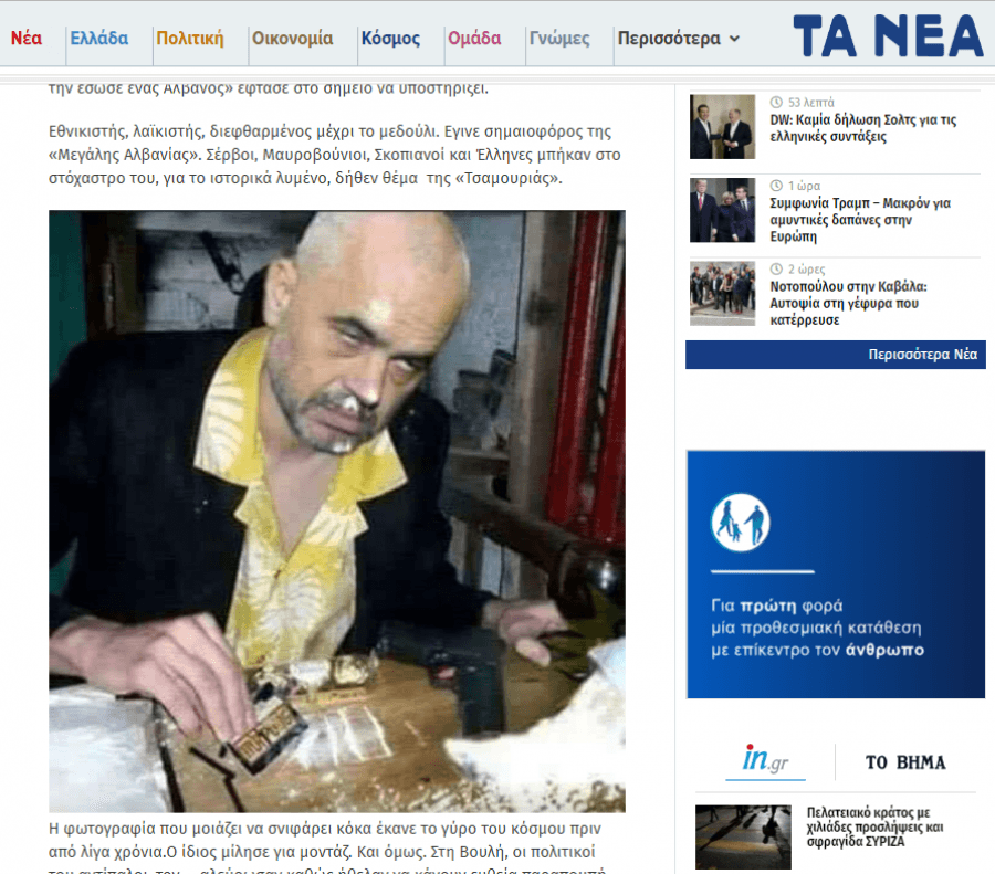 “Nacionalist, populist, i korruptuar deri në palcë. Ai është bërë flamurtari i ‘Shqipërisë së Madhe’. Serbët, malazezët, maqedonasit dhe grekët janë në vëmendjen e tij, në përpjekjet e tij për çështjen e zgjidhur historikisht ‘Çamëria,” shkruan “Ta Nea” e cila publikon edhe foton e Edi Ramës, “ku është duke pirë kokainë, por që vetë Rama e quan montazh”.