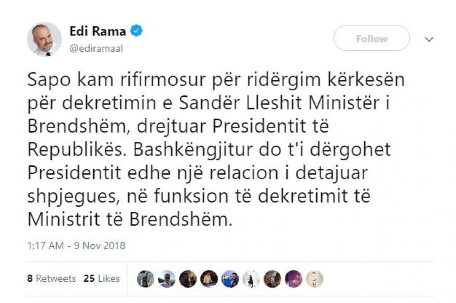 “Sapo kam rifirmosur për ridërgim kërkesën për dekretimin e Sandër Lleshit Ministër i Brendshëm, drejtuar Presidentit të Republikës. Bashkëngjitur do t’i dërgohet Presidentit edhe një relacion i detajuar shpjegues, në funksion të dekretimit të Ministrit të Brendshëm.”