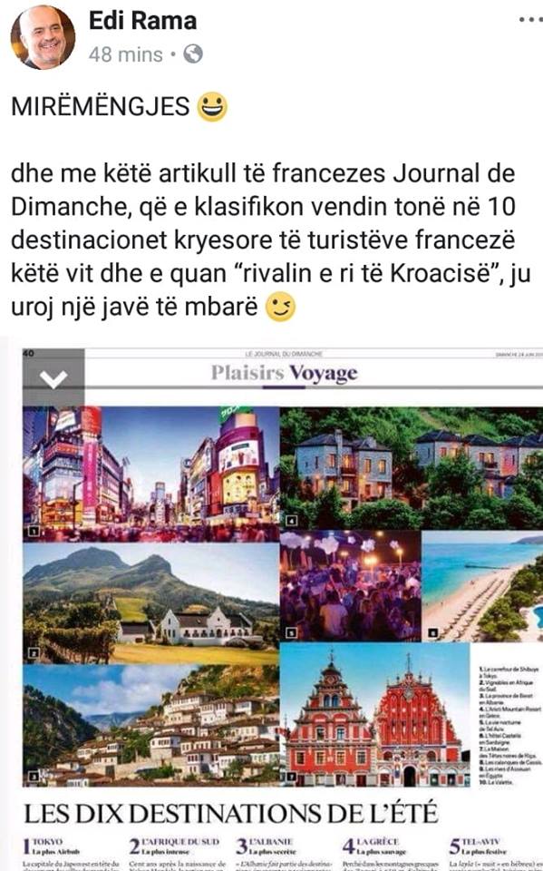 Duke publikuar në Facebook një artikull të “Journal de Dimanche”, që e klasifikon vendin tonë në 10 destinacionet kryesore të turistëve francezë këtë vit, Edi Rama thekson faktin se Shqipëria është “rivali i ri të Kroacisë”!