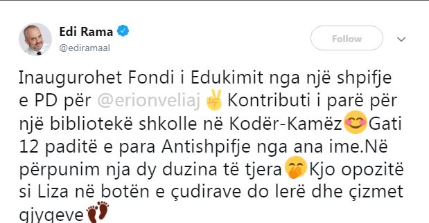 Ndërsa Edi Rama i ndodhur para faktit të kryer u bë sikur e pyeti njeri si për pdai ashtu edhe Fondin dhe nga goditja që pësoi nga “turbulliar shpirtërore” e Erion Veliajt mezi arriti të kap celularin dhe ti drejtohet edhe atyre pak socialistëve që i lexojnë mesazhet e tij ne rrjetet sociale: