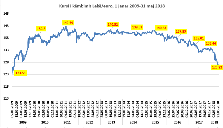 Ky është niveli më i ulët që nga janari i vitit 2009, kur euro e hapi vitin në kuotat e 123-124 lekëve, por më pas u rrit për të arritur në nivelin rekord në mes të vitit 2011, kur arriti në 142.6 lekë. Më pas, euro ishte në nivele të qëndrueshme për 6 vjet, duke u këmbyer midis 139-140 lekë. Rënia nisi në gjysmën e dytë të vitit 2016 dhe ka vijuar në mënyrë të qëndrueshme, duke u përshpejtuar në muajt e parë të këtij viti.