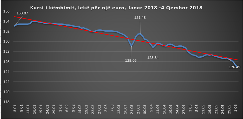 Ky është niveli më i ulët që nga janari i vitit 2009, kur euro e hapi vitin në kuotat e 123-124 lekëve, por më pas u rrit për të arritur në nivelin rekord në mes të vitit 2011, kur arriti në 142.6 lekë. Më pas, euro ishte në nivele të qëndrueshme për 6 vjet, duke u këmbyer midis 139-140 lekë. Rënia nisi në gjysmën e dytë të vitit 2016 dhe ka vijuar në mënyrë të qëndrueshme, duke u përshpejtuar në muajt e parë të këtij viti.
