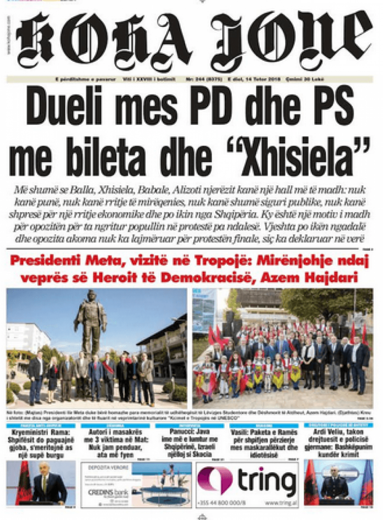 Faqet e para të shtypit të ditës, 14 tetor 2018 KryesoretRisi By Pa frike On Tet 14, 2018 85 faqet e parashtypi i dites 85 Ndaj FacebookTwitterLinkedinGoogle+