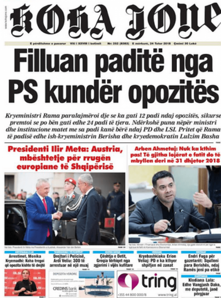Faqet e para të shtypit të ditës, 24 tetor 2018 KryesoretRisi By Pa frike Last updated Tet 24, 2018 91 Këto janë faqet e para të shtypit të ditës, datë 24 tetor 2018: faqet e parashtypi i dites 91 Ndaj FacebookTwitterLinkedinGoogle+
